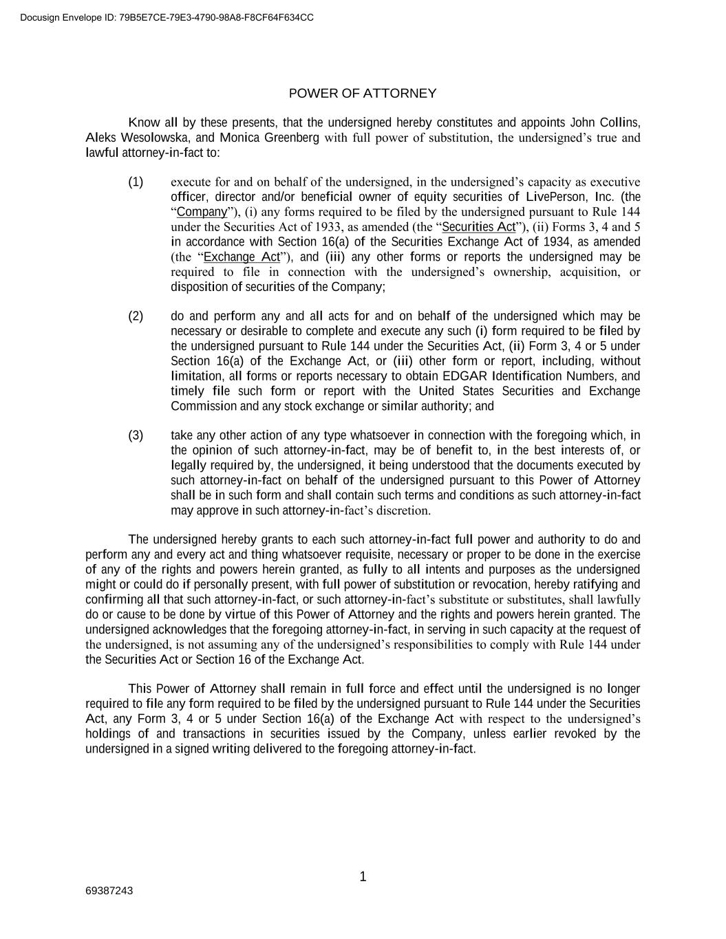 1 69387243 POWER OF ATTORNEY Know all by these presents, that the undersigned hereby constitutes and appoints John Collins, Aleks Wesolowska, and Monica Greenberg with full power of substitution, the undersigned’s true and lawful attorney-in-fact to: (1) execute for and on behalf of the undersigned, in the undersigned’s capacity as executive officer, director and/or beneficial owner of equity securities of LivePerson, Inc. (the “Company”), (i) any forms required to be filed by the undersigned pursuant to Rule 144 under the Securities Act of 1933, as amended (the “Securities Act”), (ii) Forms 3, 4 and 5 in accordance with Section 16(a) of the Securities Exchange Act of 1934, as amended (the “Exchange Act”), and (iii) any other forms or reports the undersigned may be required to file in connection with the undersigned’s ownership, acquisition, or disposition of securities of the Company; (2) do and perform any and all acts for and on behalf of the undersigned which may be necessary or desirable to complete and execute any such (i) form required to be filed by the undersigned pursuant to Rule 144 under the Securities Act, (ii) Form 3, 4 or 5 under Section 16(a) of the Exchange Act, or (iii) other form or report, including, without limitation, all forms or reports necessary to obtain EDGAR Identification Numbers, and timely file such form or report with the United States Securities and Exchange Commission and any stock exchange or similar authority; and (3) take any other action of any type whatsoever in connection with the foregoing which, in the opinion of such attorney-in-fact, may be of benefit to, in the best interests of, or legally required by, the undersigned, it being understood that the documents executed by such attorney-in-fact on behalf of the undersigned pursuant to this Power of Attorney shall be in such form and shall contain such terms and conditions as such attorney-in-fact may approve in such attorney-in-fact’s discretion. The undersigned hereby grants to each such attorney-in-fact full power and authority to do and perform any and every act and thing whatsoever requisite, necessary or proper to be done in the exercise of any of the rights and powers herein granted, as fully to all intents and purposes as the undersigned might or could do if personally present, with full power of substitution or revocation, hereby ratifying and confirming all that such attorney-in-fact, or such attorney-in-fact’s substitute or substitutes, shall lawfully do or cause to be done by virtue of this Power of Attorney and the rights and powers herein granted. The undersigned acknowledges that the foregoing attorney-in-fact, in serving in such capacity at the request of the undersigned, is not assuming any of the undersigned’s responsibilities to comply with Rule 144 under the Securities Act or Section 16 of the Exchange Act. This Power of Attorney shall remain in full force and effect until the undersigned is no longer required to file any form required to be filed by the undersigned pursuant to Rule 144 under the Securities Act, any Form 3, 4 or 5 under Section 16(a) of the Exchange Act with respect to the undersigned’s holdings of and transactions in securities issued by the Company, unless earlier revoked by the undersigned in a signed writing delivered to the foregoing attorney-in-fact. Docusign Envelope ID: 79B5E7CE-79E3-4790-98A8-F8CF64F634CC