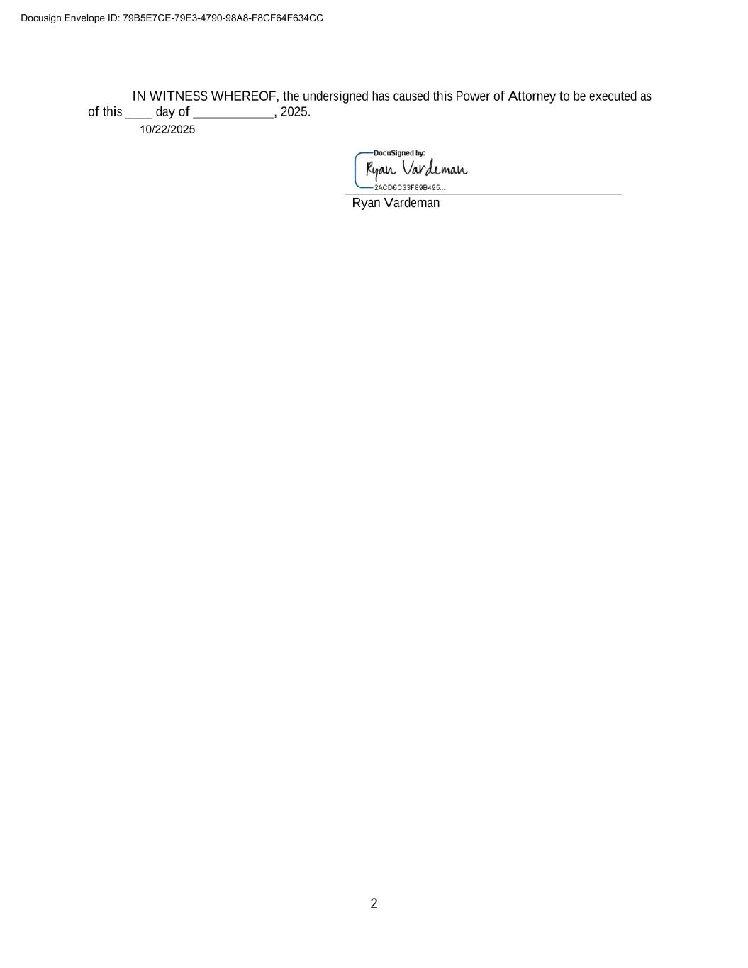 2 IN WITNESS WHEREOF, the undersigned has caused this Power of Attorney to be executed as of this ____ day of ____________, 2025. Ryan Vardeman Docusign Envelope ID: 79B5E7CE-79E3-4790-98A8-F8CF64F634CC 10/22/2025