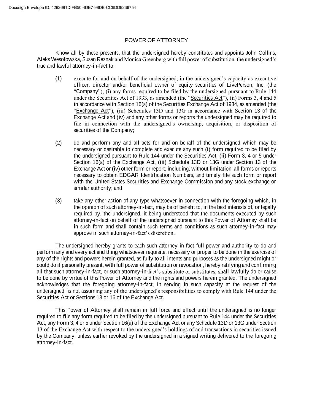 POWER OF ATTORNEY Know all by these presents, that the undersigned hereby constitutes and appoints John Collins, Aleks Wesolowska, Susan Reznak and Monica Greenberg with full power of substitution, the undersigned’s true and lawful attorney-in-fact to: (1) execute for and on behalf of the undersigned, in the undersigned’s capacity as executive officer, director and/or beneficial owner of equity securities of LivePerson, Inc. (the “Company”), (i) any forms required to be filed by the undersigned pursuant to Rule 144 under the Securities Act of 1933, as amended (the “Securities Act”), (ii) Forms 3, 4 and 5 in accordance with Section 16(a) of the Securities Exchange Act of 1934, as amended (the “Exchange Act”), (iii) Schedules 13D and 13G in accordance with Section 13 of the Exchange Act and (iv) and any other forms or reports the undersigned may be required to file in connection with the undersigned’s ownership, acquisition, or disposition of securities of the Company; (2) do and perform any and all acts for and on behalf of the undersigned which may be necessary or desirable to complete and execute any such (i) form required to be filed by the undersigned pursuant to Rule 144 under the Securities Act, (ii) Form 3, 4 or 5 under Section 16(a) of the Exchange Act, (iii) Schedule 13D or 13G under Section 13 of the Exchange Act or (iv) other form or report, including, without limitation, all forms or reports necessary to obtain EDGAR Identification Numbers, and timely file such form or report with the United States Securities and Exchange Commission and any stock exchange or similar authority; and (3) take any other action of any type whatsoever in connection with the foregoing which, in the opinion of such attorney-in-fact, may be of benefit to, in the best interests of, or legally required by, the undersigned, it being understood that the documents executed by such attorney-in-fact on behalf of the undersigned pursuant to this Power of Attorney shall be in such form and shall contain such terms and conditions as such attorney-in-fact may approve in such attorney-in-fact’s discretion. The undersigned hereby grants to each such attorney-in-fact full power and authority to do and perform any and every act and thing whatsoever requisite, necessary or proper to be done in the exercise of any of the rights and powers herein granted, as fully to all intents and purposes as the undersigned might or could do if personally present, with full power of substitution or revocation, hereby ratifying and confirming all that such attorney-in-fact, or such attorney-in-fact’s substitute or substitutes, shall lawfully do or cause to be done by virtue of this Power of Attorney and the rights and powers herein granted. The undersigned acknowledges that the foregoing attorney-in-fact, in serving in such capacity at the request of the undersigned, is not assuming any of the undersigned’s responsibilities to comply with Rule 144 under the Securities Act or Sections 13 or 16 of the Exchange Act. This Power of Attorney shall remain in full force and effect until the undersigned is no longer required to file any form required to be filed by the undersigned pursuant to Rule 144 under the Securities Act, any Form 3, 4 or 5 under Section 16(a) of the Exchange Act or any Schedule 13D or 13G under Section 13 of the Exchange Act with respect to the undersigned’s holdings of and transactions in securities issued by the Company, unless earlier revoked by the undersigned in a signed writing delivered to the foregoing attorney-in-fact. Docusign Envelope ID: 4292691D-FB50-4DE7-98DB-CC6DD9236754