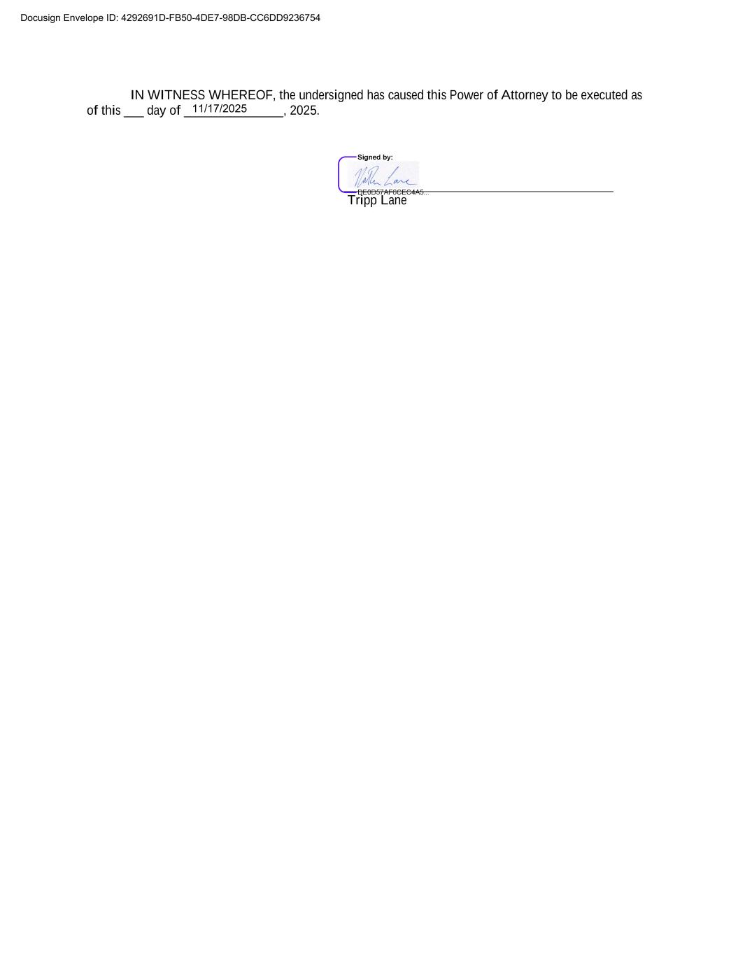 IN WITNESS WHEREOF, the undersigned has caused this Power of Attorney to be executed as of this ___ day of _______________, 2025. Tripp Lane Docusign Envelope ID: 4292691D-FB50-4DE7-98DB-CC6DD9236754 11/17/2025